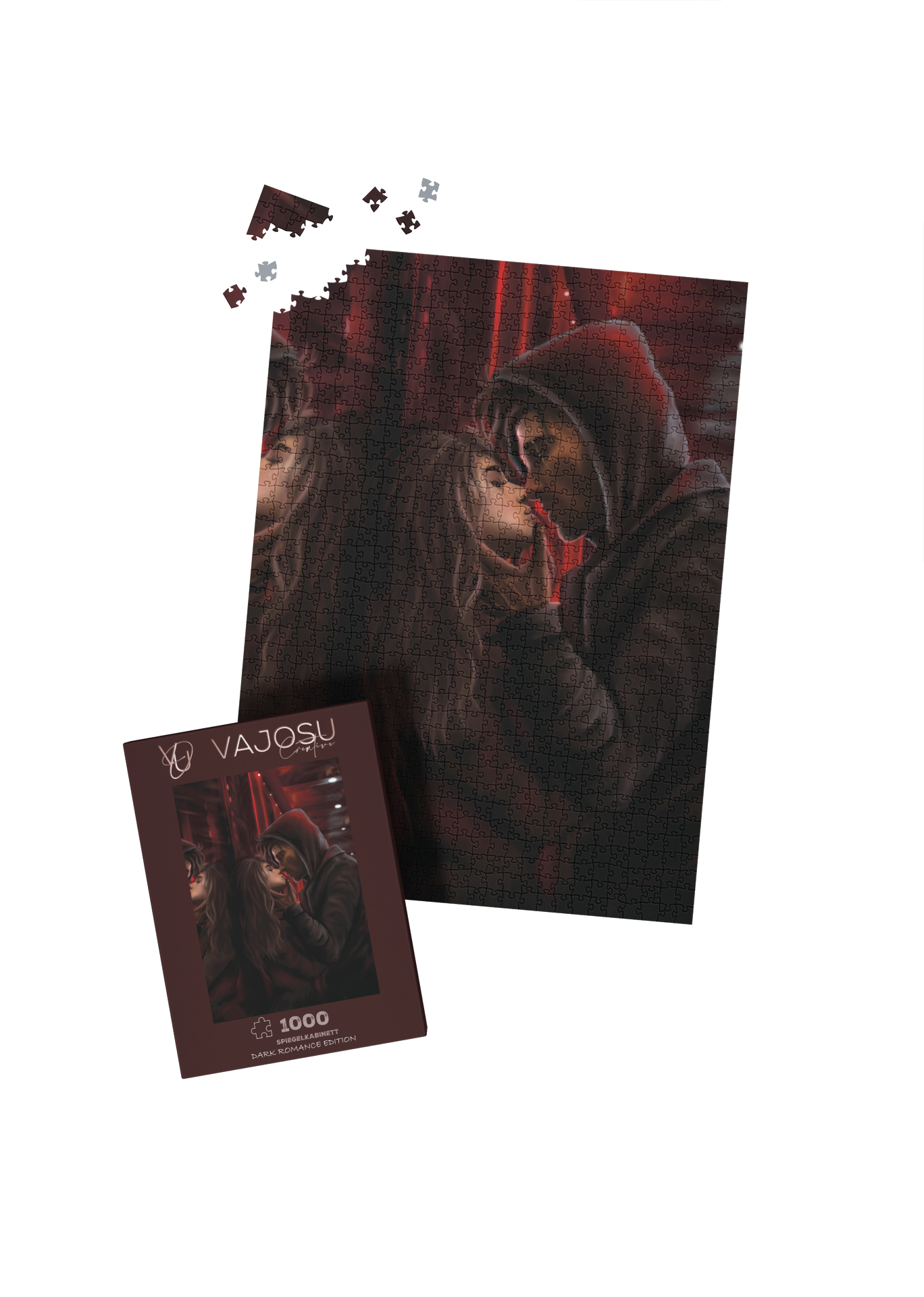 Betritt das Spiegelkabinett, einen Ort voller Schatten, Geheimnisse und verbotenem Verlangen. Dieses exklusive 1000-Teile-Puzzle fängt die Atmosphäre eines Raums ein, in dem Realität und Illusion verschwimmen – ein visuelles Echo aus Leidenschaft, Gefahr und Obsession.